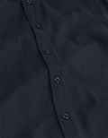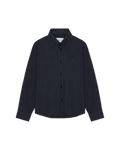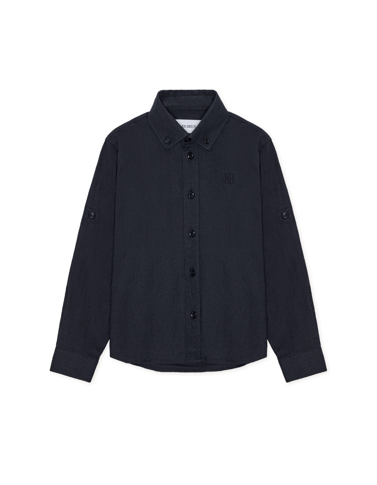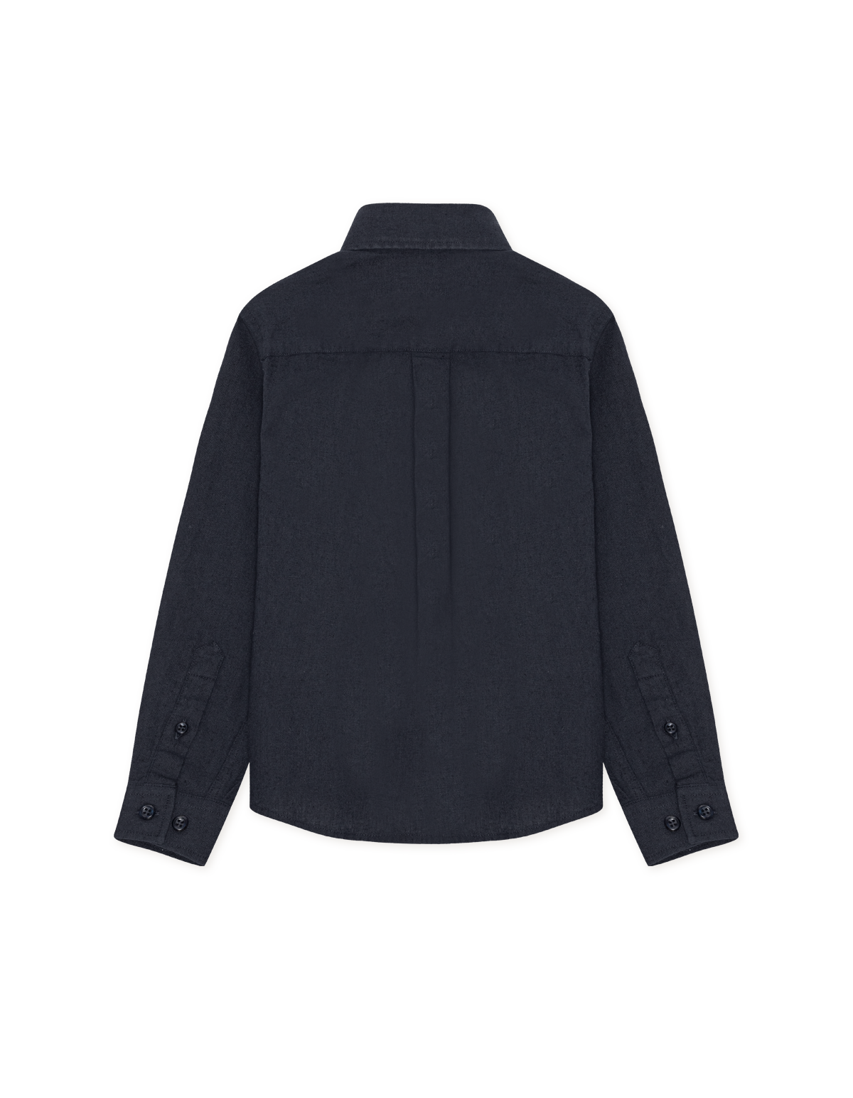 En avslappet skjorte med knappelukking i en sprø bomull/linblanding. Avsluttet med ermestropp og tonalt broderi på brystet for en ren sommerlook.