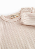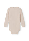 Enkel langermet babybody i pointelle-modell som lukkes med trykknapper på venstre skulder og mellom bena for enkelt bleieskift. Bodystockingen har picotkanter og er myk, elastisk og behagelig å ha på seg.