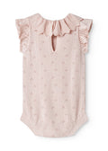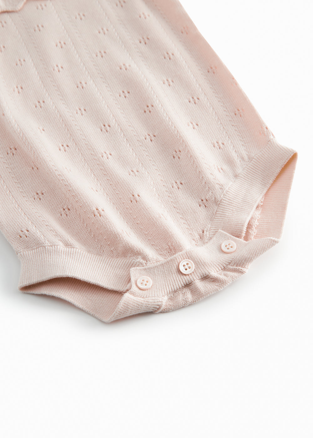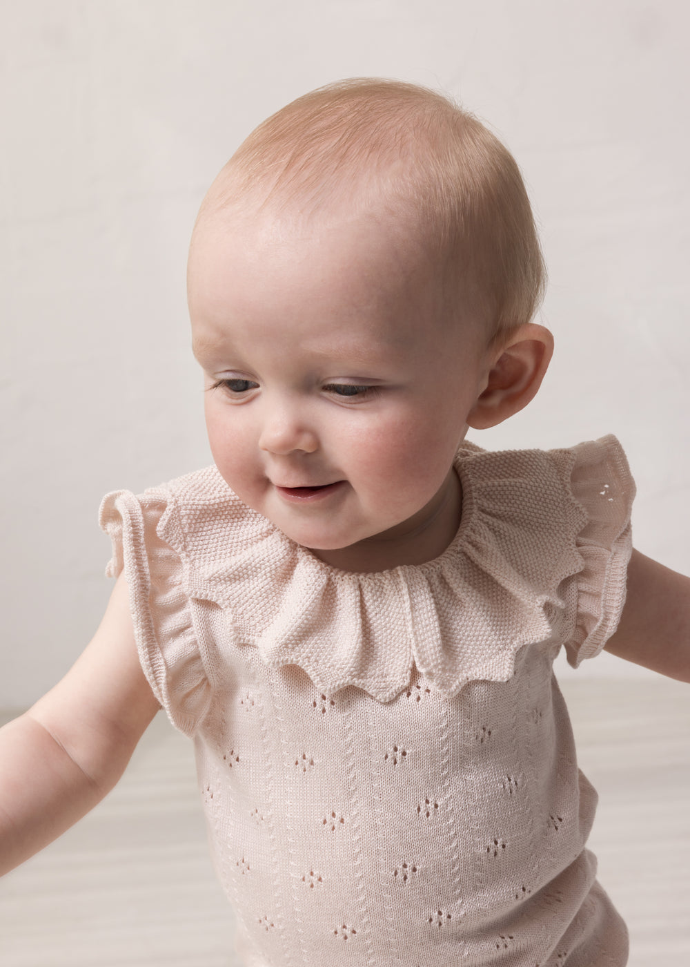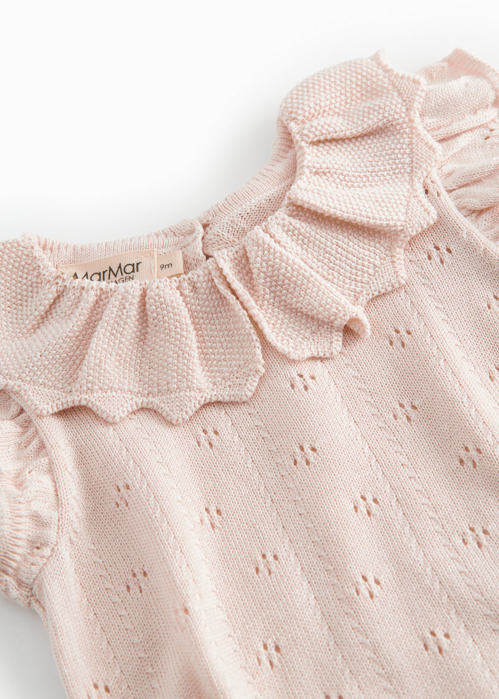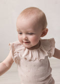Kortermet strikket babybody med hullmønster og volangkrage. Har små volanger ved ermehullene, ribbekanter og knappelukking bak og mellom bena for enklere bleieskift.