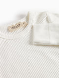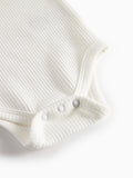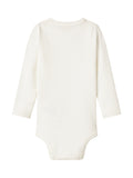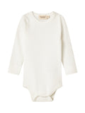 Langermet ribbestrikket body med knepping på den ene skulderen og mellom bena. Myk, elastisk og behagelig å ha på. 100% naturlig materiale og pustende kvalitet.