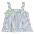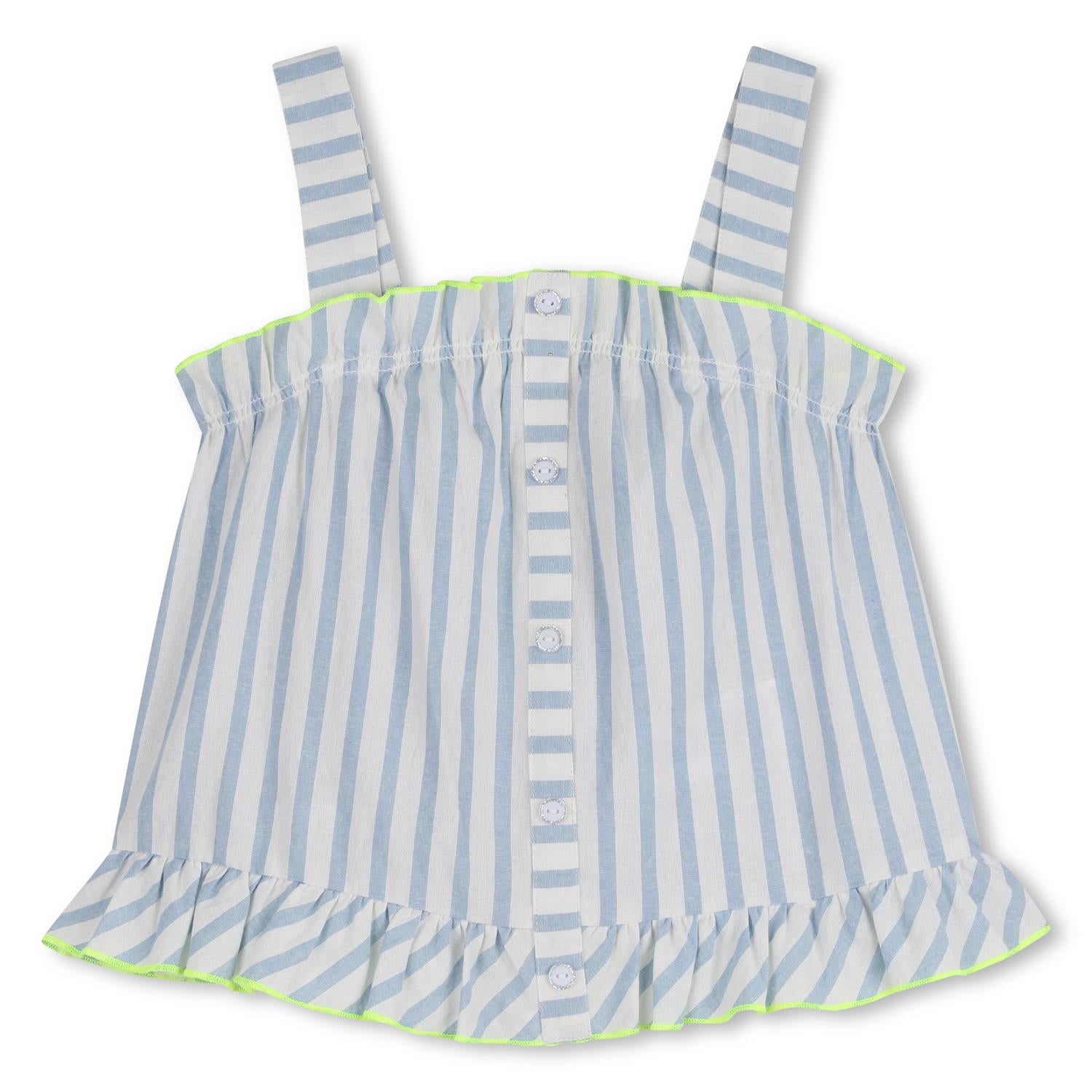 Sommerfriskhet for små oppdagelsesreisende: Denne stroppeformede bomullsblusen fra BILLIEBLUSH kombinerer et delikat stripete trykk med lekne rysjer øverst og nederst. Den kontrasterende bourdon-stoffet understreker hver detalj med sjarm. Lett og enkel å ha på seg, den lover dager fulle av lek og fantasi, vi elsker dens elegante og rampete side.