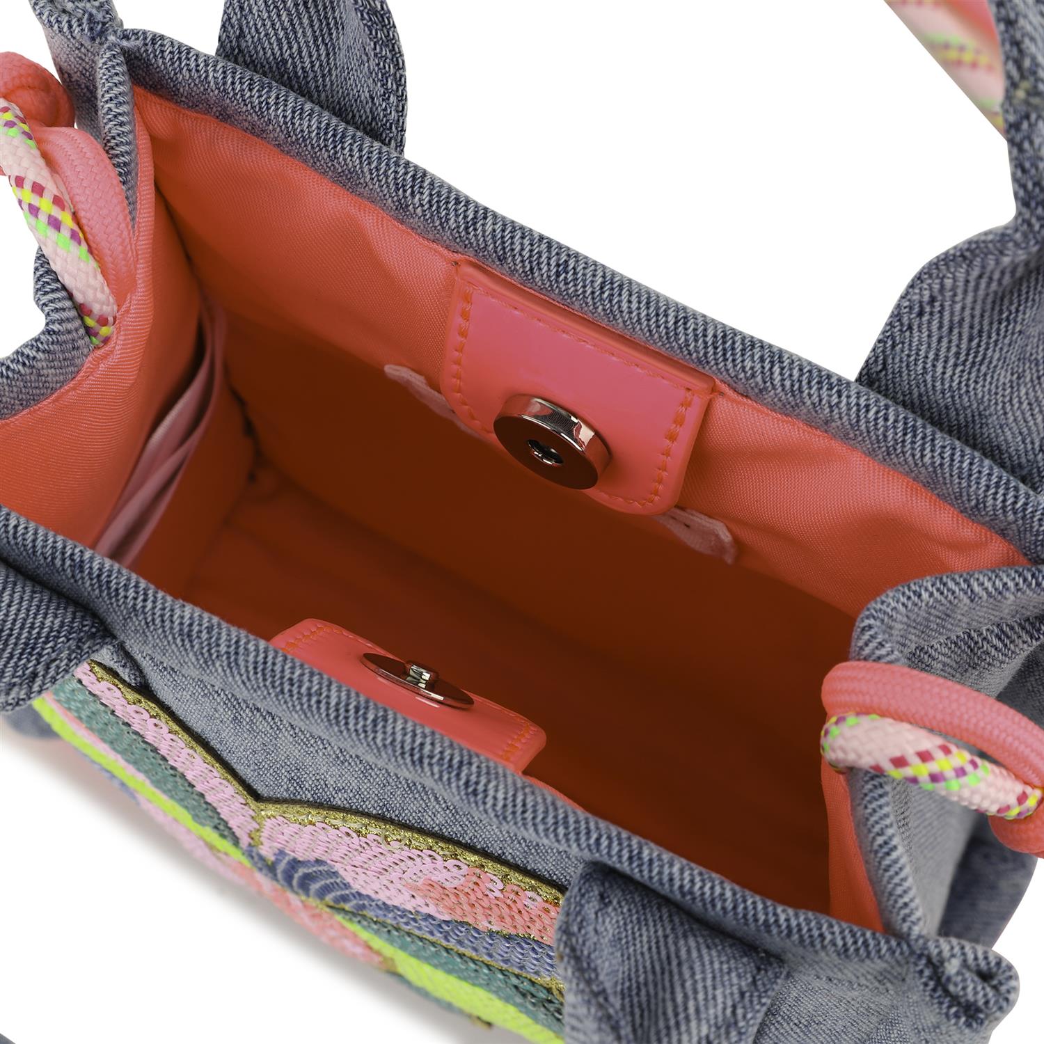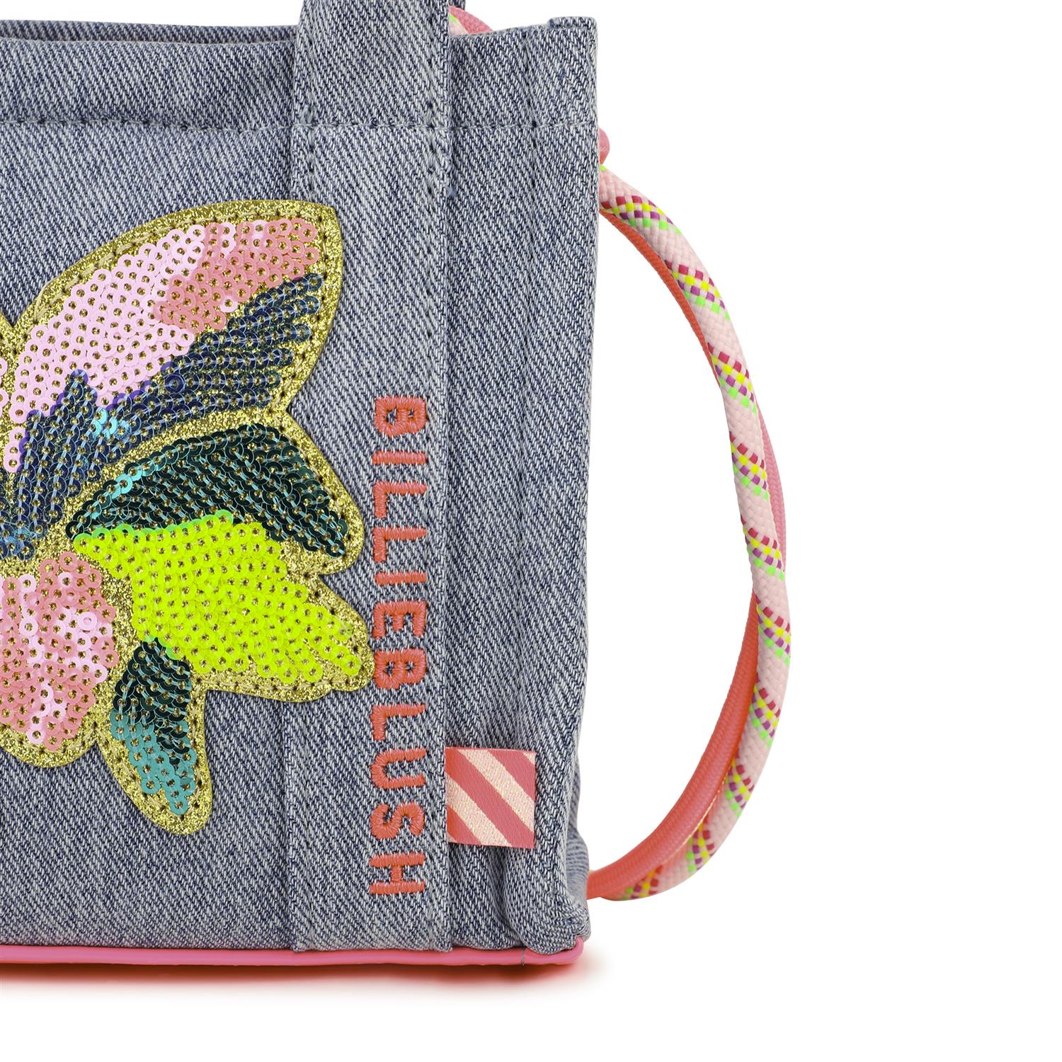 Morsom liten BILLIEBLUSH-veske i denim og tekstil med gummieffekt, perfekt for småbarns utflukter. Blomsterillustrasjonen utsmykket med skinnende paljetter og den broderte logoen gir den et lekent og elegant utseende. Den flerfargede skulderstroppen i tau gir et lekent preg, mens magnetlukkingen og den stripete vevde etiketten tar seg av de praktiske detaljene. Kompakte mål, ideelle for ethvert eventyr: 14,5 x 14,5 x 5 cm.